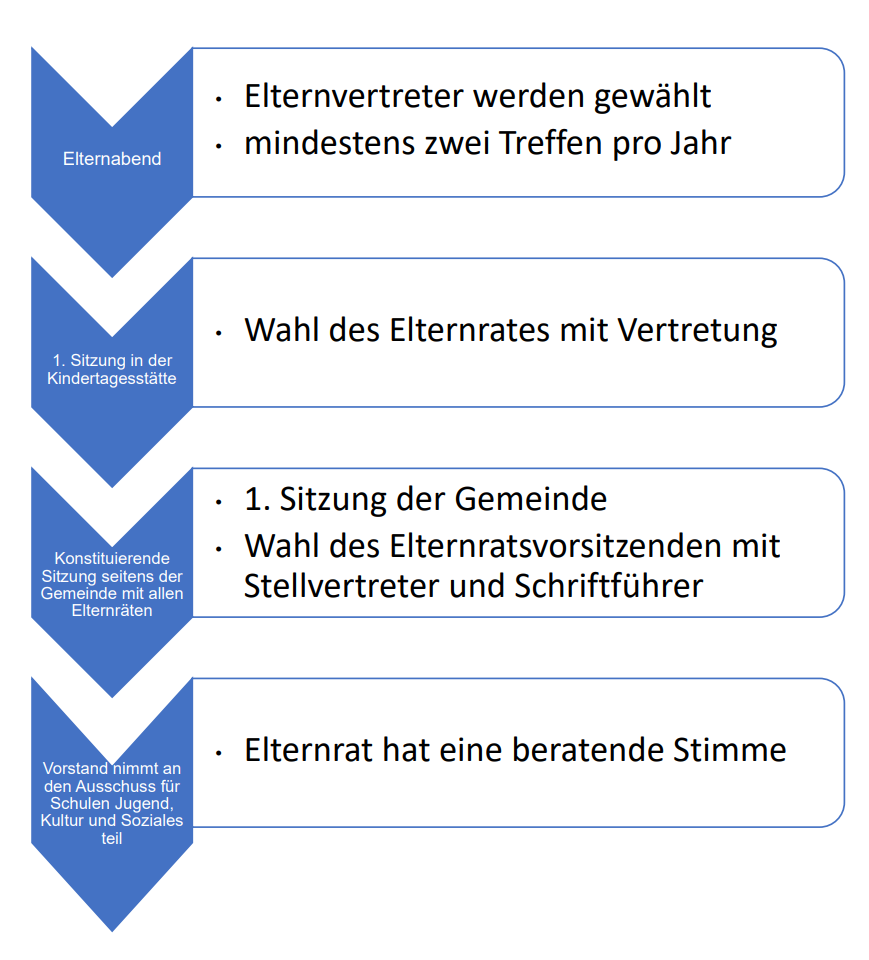Alle Elternvertreter der Kindertagesstätte treffen sich nach den Wahlen mit der Leitung, um einen Vorsitzenden für den Elternbeirat und Vertreter zu wählen. Dieser soll die Elternvertreter mindestens einmal halbjährlich zu einer Sitzung einladen. Weiter wird viermal jährlich zu einer konstituierenden Sitzung seitens der Gemeinde eingeladen. Beim ersten Treffen werden von allen Elternbeiräten der Kindertagesstätten ein Vorsitzender, Stellvertreter und Schriftführer gewählt. Dieser Vorstand nimmt an dem Ausschuss für Schulen, Jugend, Kultur und Soziales teil und hat einen Sitz mit beratender Stimme.